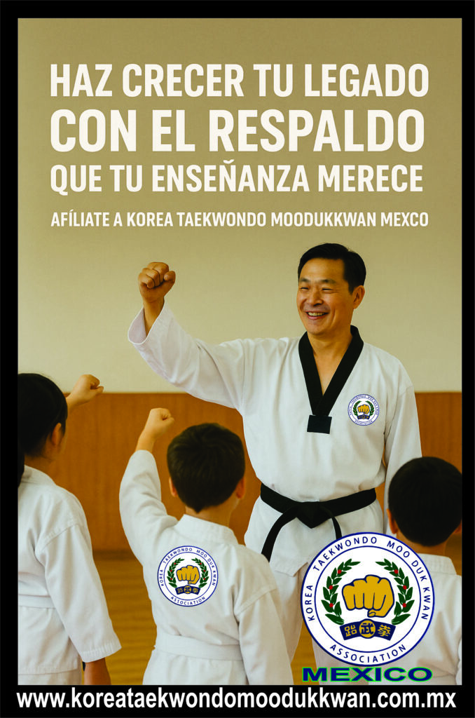 “Certifica tu escuela con el respaldo internacional y brinda a tus alumnos el prestigio que merecen. Únete a Korea Taekwondo Moodukkwan México. Prestigio, credibilidad y crecimiento en una sola asociación”.